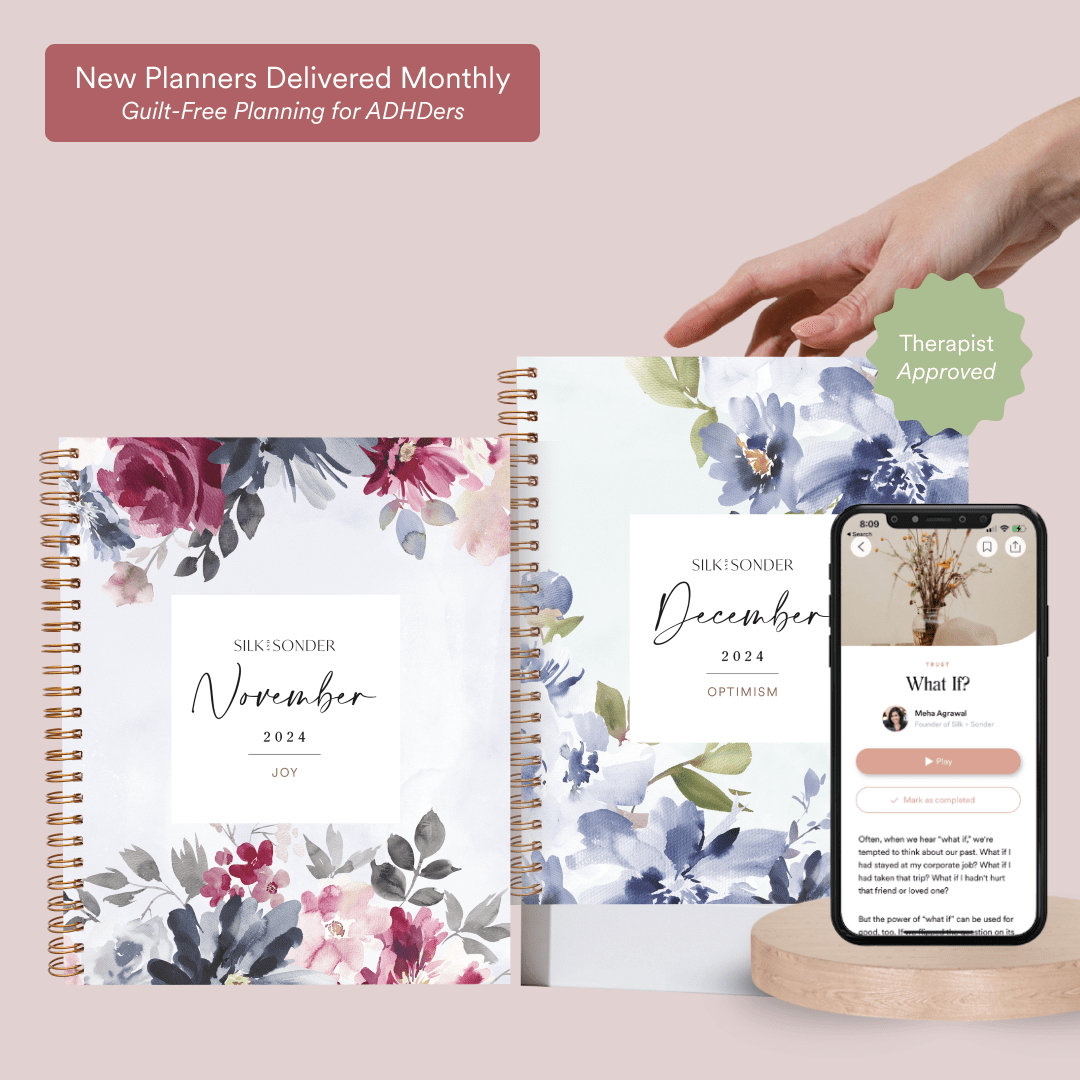 Silk + Sonder was founded by former software engineer and now life and mindset coach, Meha Agrawal who spent thousands of hours researching proven techniques from therapy, coaching, personal development research, and positive psychology to bring you an effective method for daily wellbeing and personal growth. We also partner with therapists, coaches, and other wellness experts as we introduce new content and experiences for Silk + Sonder members to help form healthy habits with proven behavioral change techniques.