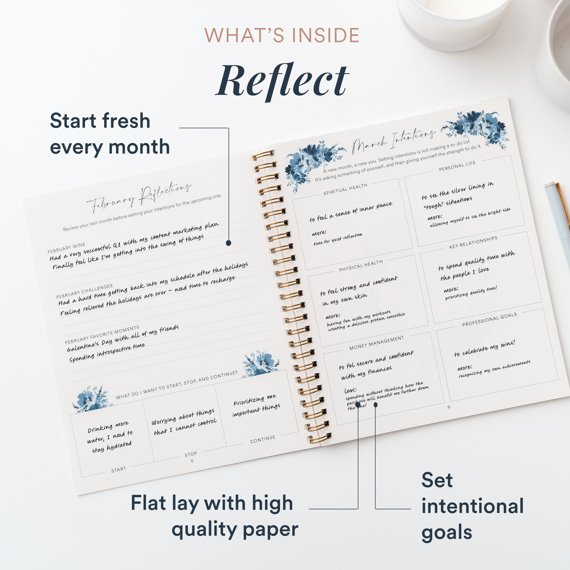We offer a fresh start and personalization with new content every month. Our monthly journals are themed with new evidence-based exercises and proven layouts and trackers for long-lasting habit formation.