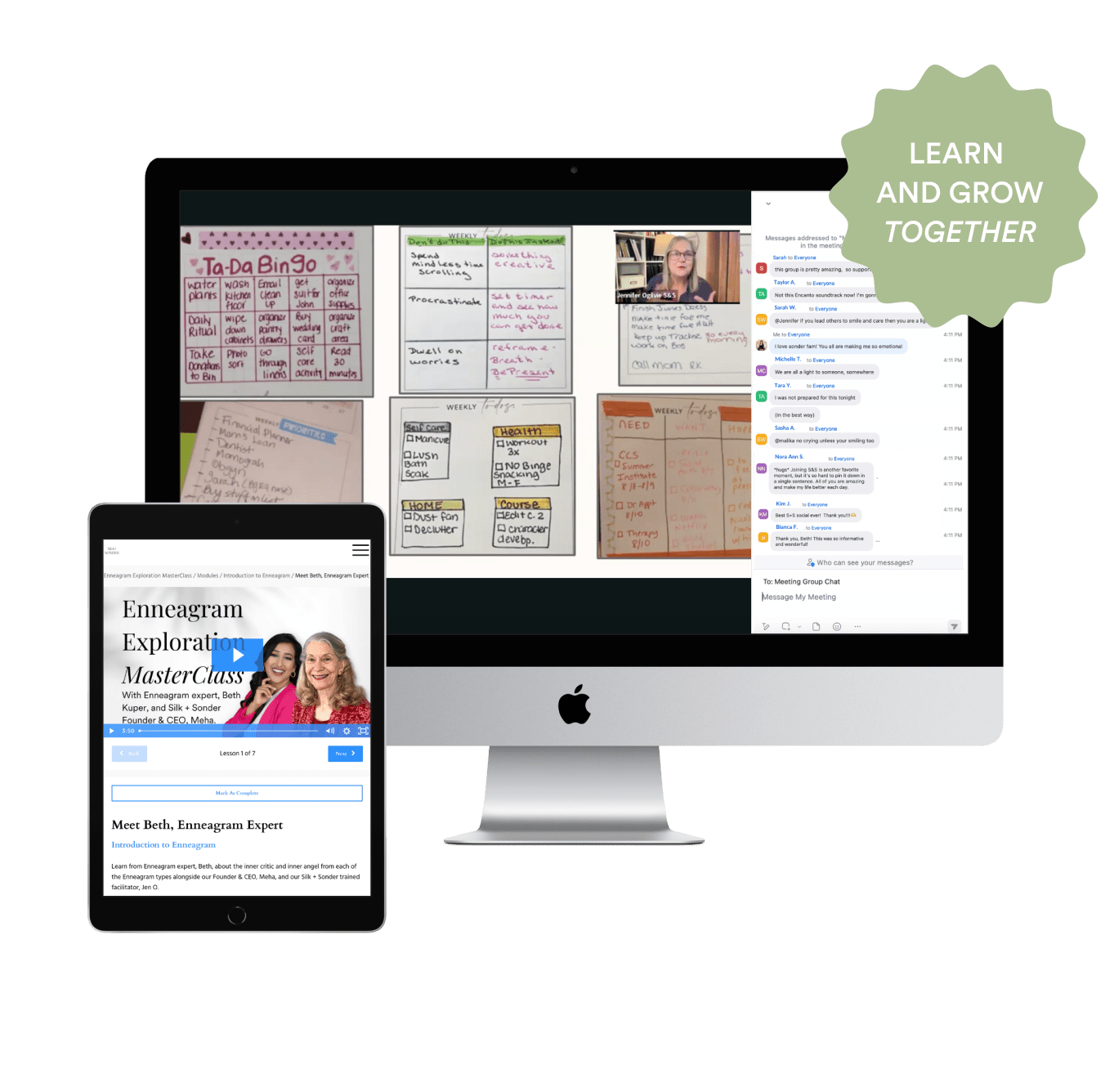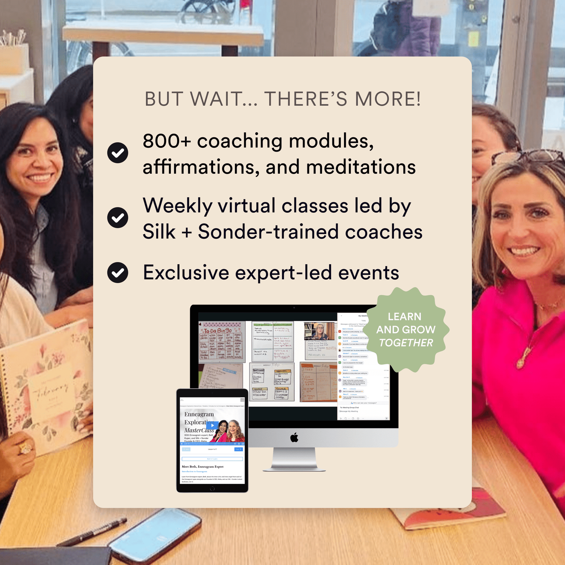 Join weekly virtual classes led by Silk + Sonder-trained coaches. Learn, grow, and connect with fellow members in real time to learn about life coaching techniques that would usually cost you thousands of dollars.