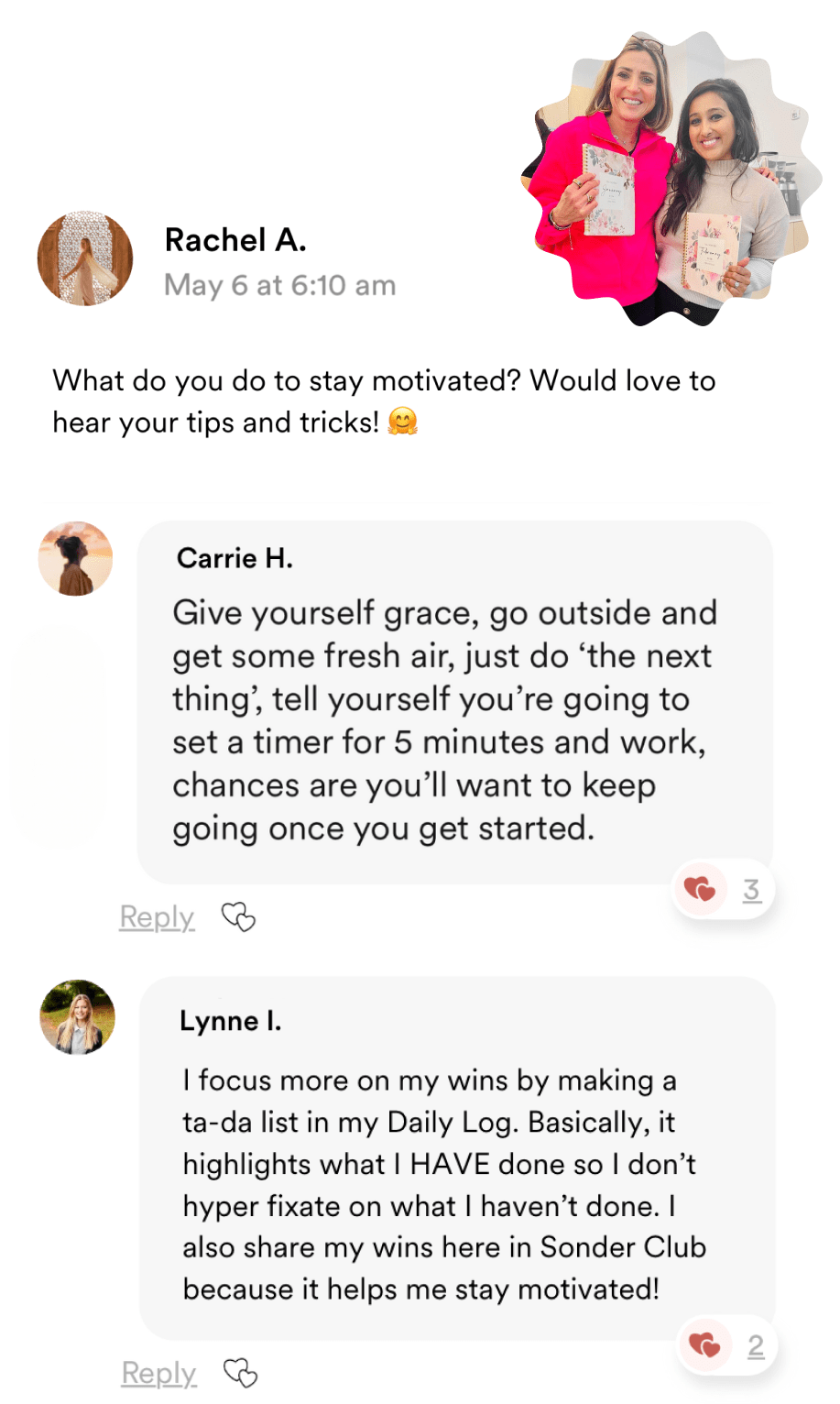 Sonder Club is a members-only, supportive space. Here, you can share personal growth tips and tricks, celebrate wins, and discuss challenges with our uplifting community.