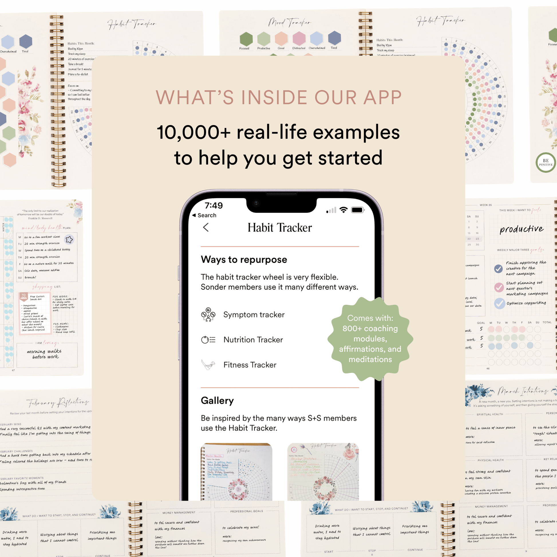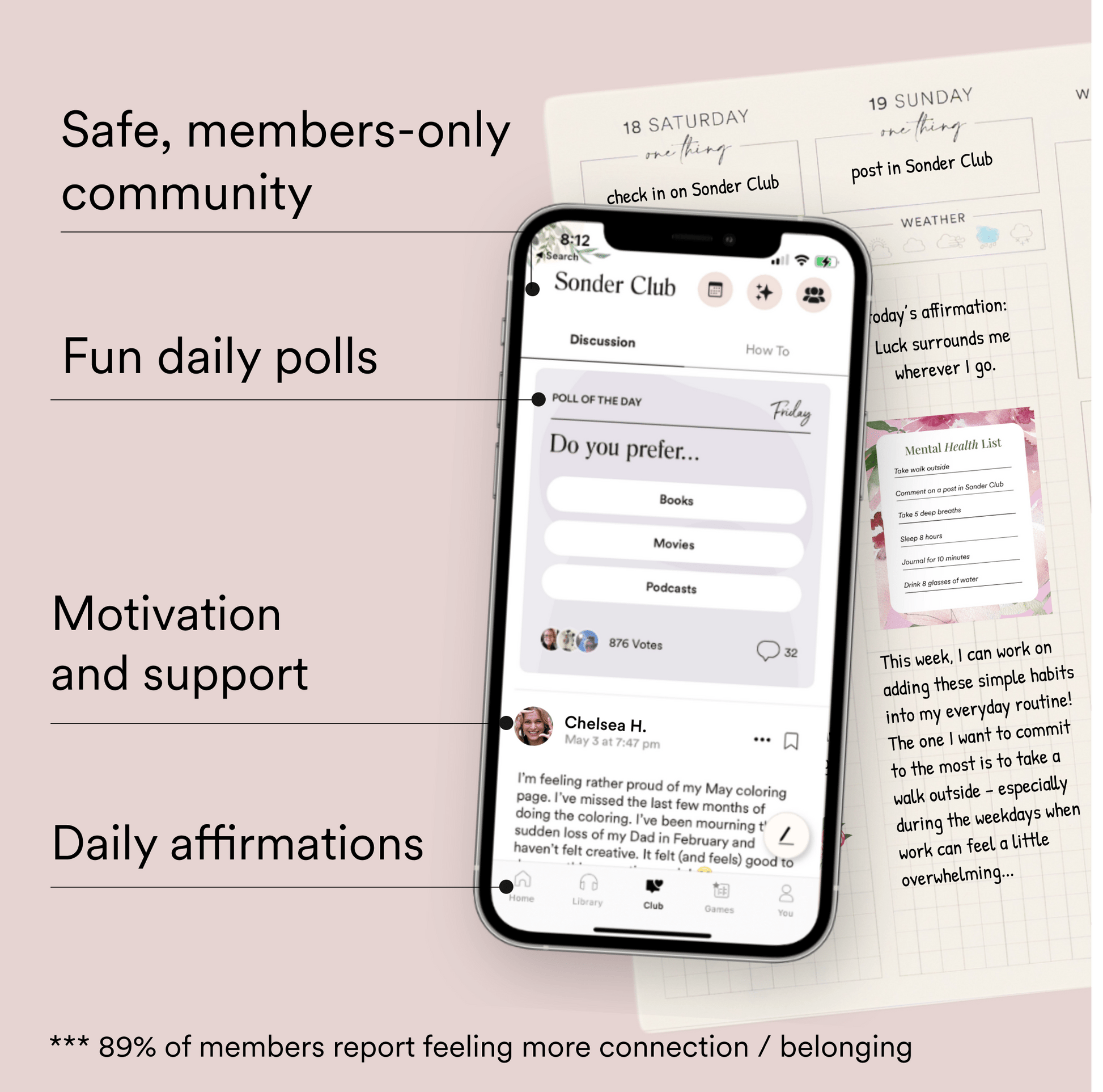 Our app includes a 21-day challenge to build your journaling habit led by our Founder & CEO, 800+ coaching modules for clarity, personalized daily affirmations and prompts, monthly self-care challenges, mini-meditations, and best of all, Sonder Club - our private members-only community.