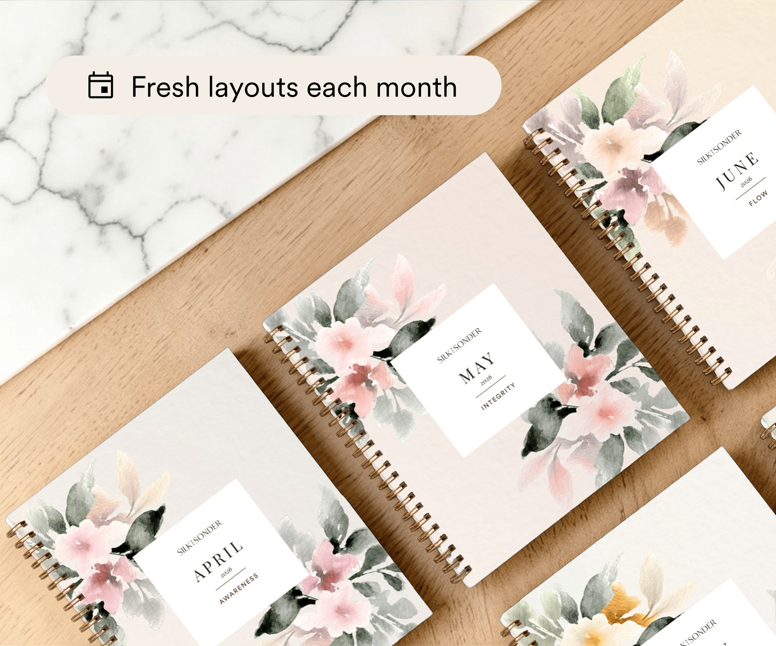Silk + Sonder is your monthly reset. Each month, you'll get a fresh, new themed guided journal delivered straight to your doorstep to help you get organized for the month ahead. Inside, you'll find therapist-approved prompts, habit and mood trackers, and easy-to-use planning pages to help bring clarity to your days. You'll also have full access to the Silk + Sonder app and members-only community, where you can explore guided meditations, affirmations, and live journaling and planning events with members like you. Everything in your membership creates a streamlined system that helps you feel more grounded, less overwhelmed, and more connected to the life you're building.