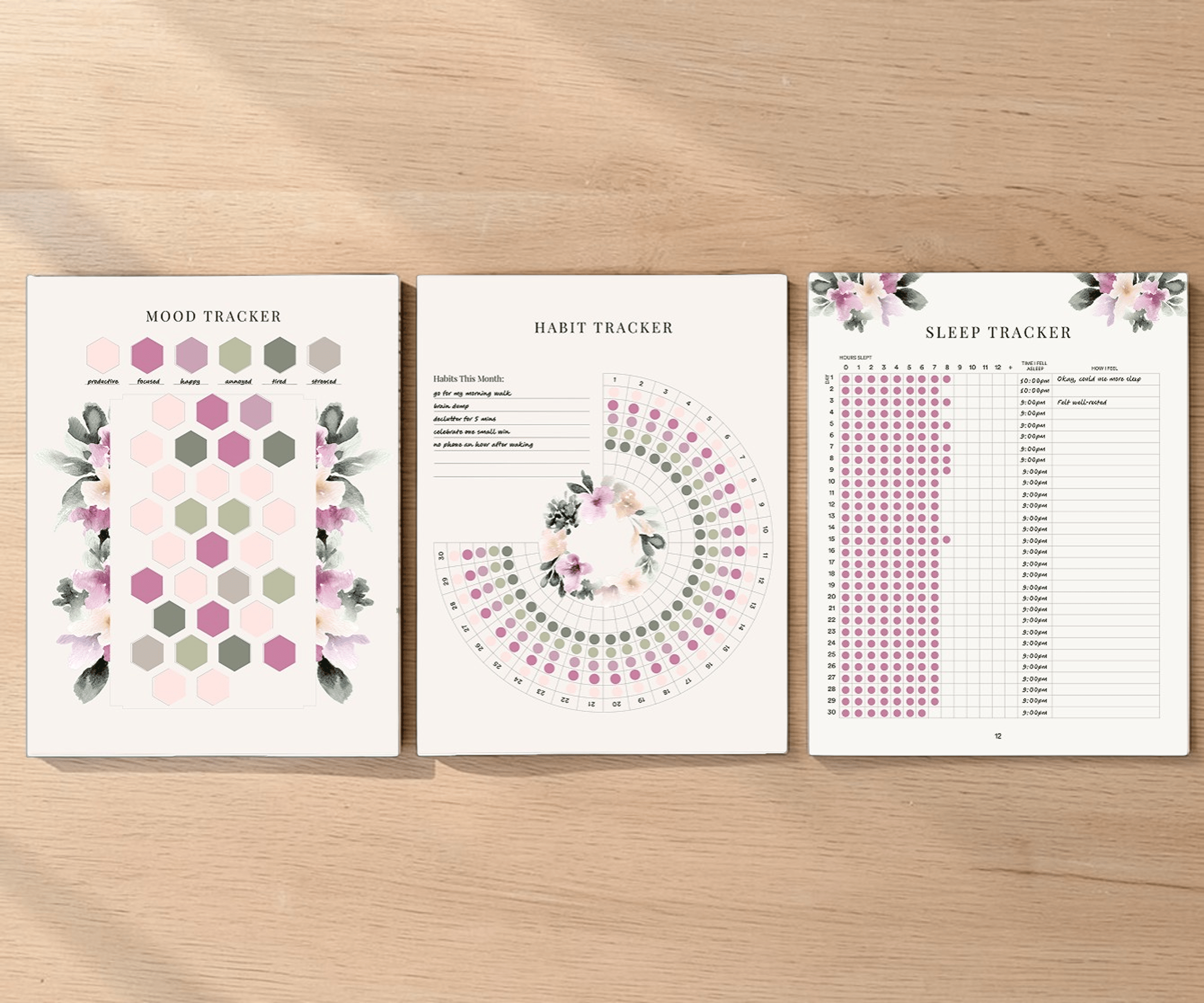 Built-in goal setting, habit building, mood and sleep tracking for improved mental clarity in a monthly format.